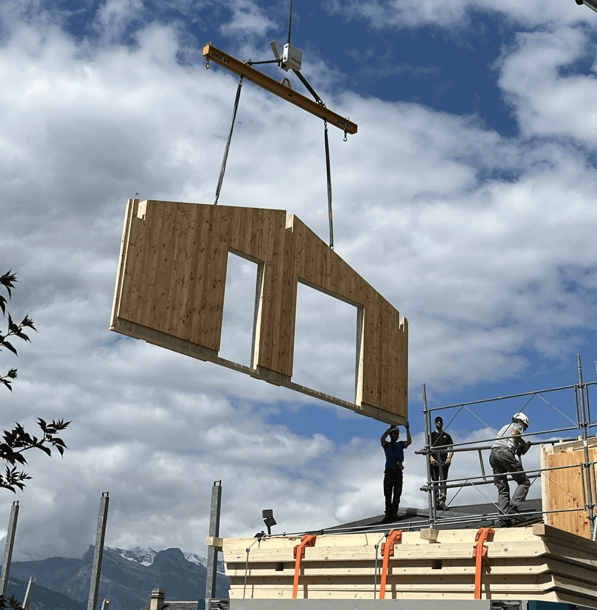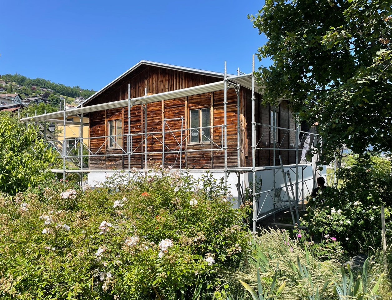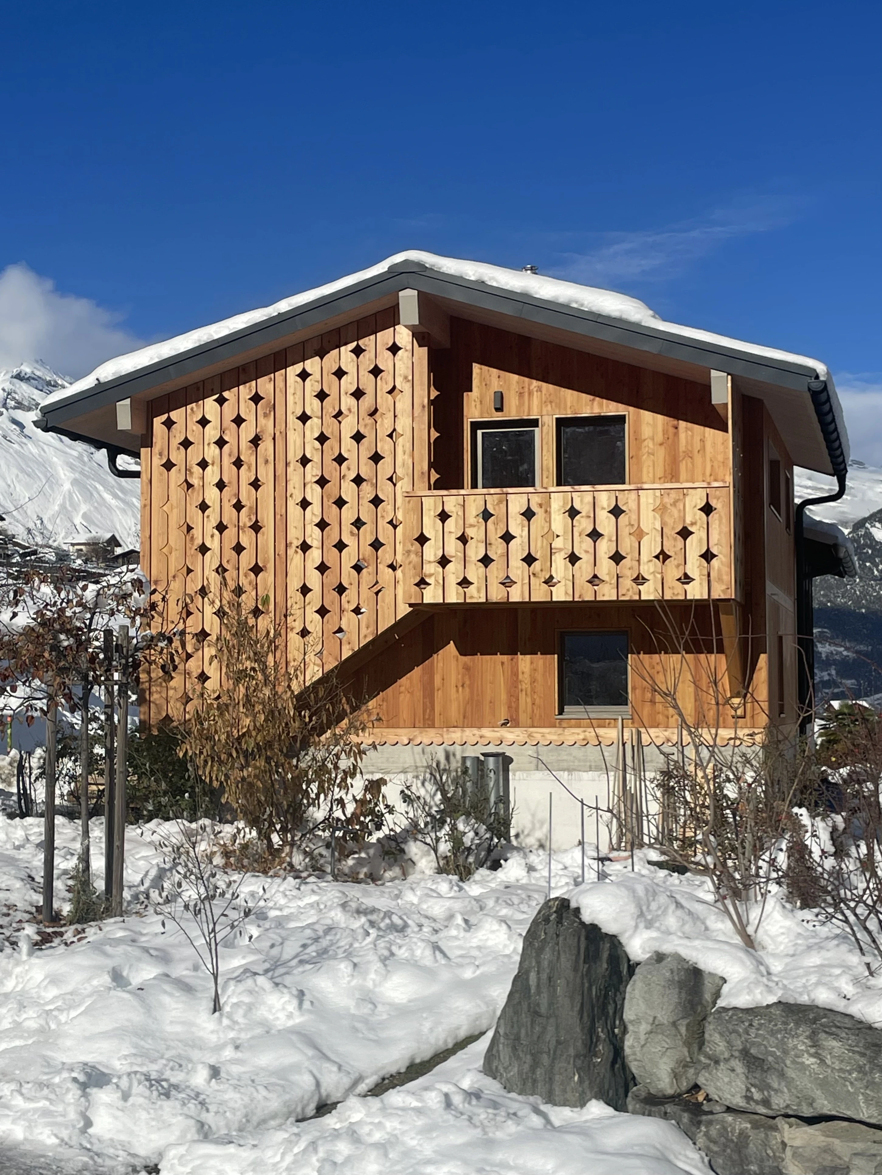 De hangar agricole à logement.La partie sud du bâtiment a été surélevée, doublant ainsi la surface de plancher existante et offrant un nouvel étage habitable. Un escalier extérieur avec balcon, inspiré des raccards traditionnels, assure l’accès à ce niveau et fait le lien avec l’architecture vernaculaire de la région. Le rez-de-chaussée conserve son usage initial d’atelier, tandis que l’étage supérieur accueille un logement baigné de lumière, pensé pour conjuguer confort moderne et respect de l’histoire du lieu.Toute l'ossature est en bois massif de la région et réalisée par l'entreprise Au Près De Mon Arbre à Vollèges. Les murs, dalle et toiture sont fait avec des superpositions de lames de bois et sans utiliser de colle ni de vis.